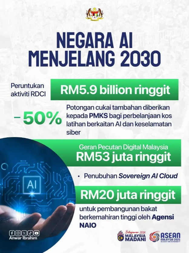 • Sovereign AI Cloud akan dibangunkan oleh SKMM dengan pelaburan RM2 bilion.