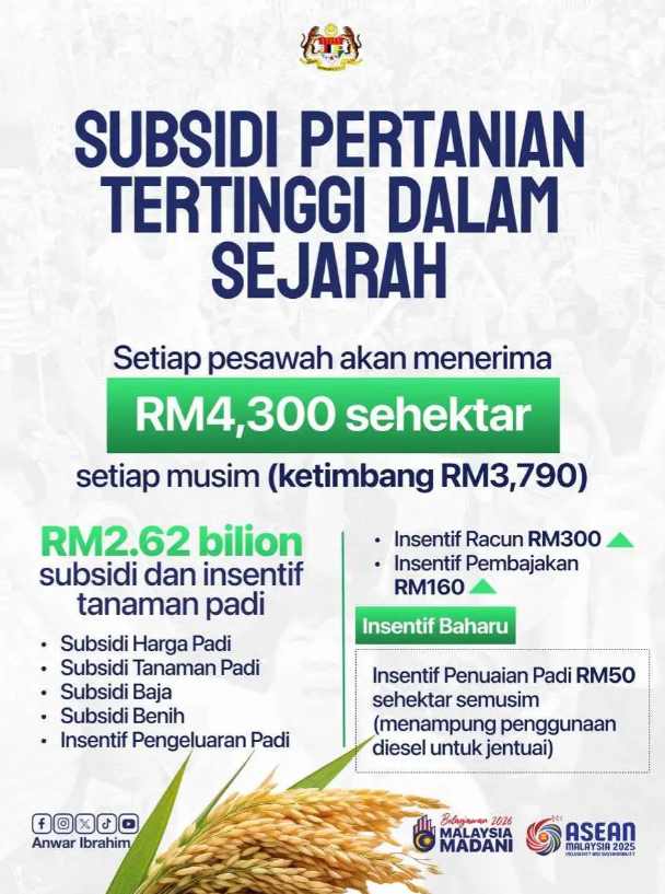 • RM2.62 bilion disediakan untuk subsidi dan bantuan pesawah.
